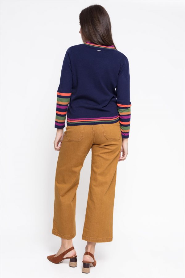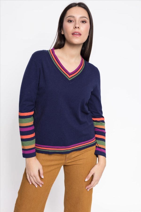 Suéter de punto en pico de fondo azul marino. El tejido es muy suave.